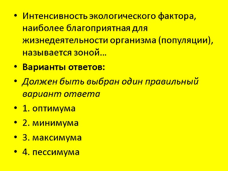 Интенсивность экологического фактора, наиболее благоприятная для жизнедеятельности организма (популяции), называется зоной… Варианты ответов: Должен быть выбран один правильный вариант ответа 1. оптимума 2. минимума 3. максимума 4. пессимума