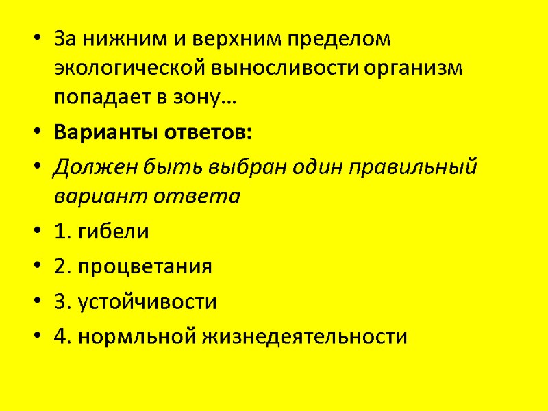 За нижним и верхним пределом экологической выносливости организм попадает в зону… Варианты ответов: Должен быть выбран один правильный вариант ответа 1. гибели 2. процветания 3. устойчивости 4. нормльной жизнедеятельности