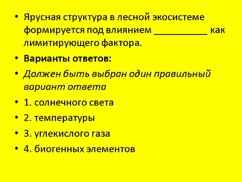 Ярусная структура в лесной экосистеме формируется под влиянием __________ как лимитирующего фактора. Варианты ответов: Должен быть выбран один правильный вариант ответа 1. солнечного света 2. температуры 3. углекислого газа 4. биогенных элементов