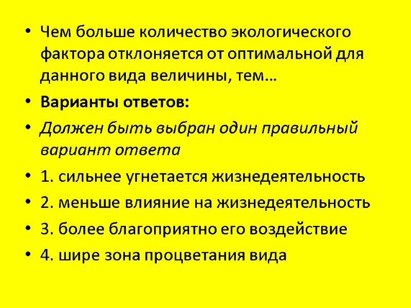Чем больше количество экологического фактора отклоняется от оптимальной для данного вида величины, тем… Варианты ответов: Должен быть выбран один правильный вариант ответа 1. сильнее угнетается жизнедеятельность 2. меньше влияние на жизнедеятельность 3. более благоприятно его воздействие 4. шире зона процветания вида
