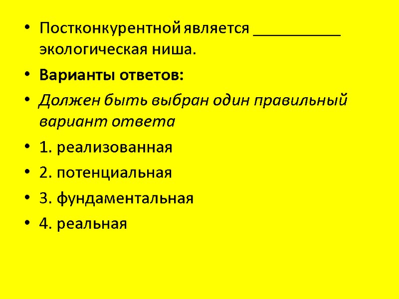 Постконкурентной является __________ экологическая ниша. Варианты ответов: Должен быть выбран один правильный вариант ответа 1. реализованная 2. потенциальная 3. фундаментальная 4. реальная