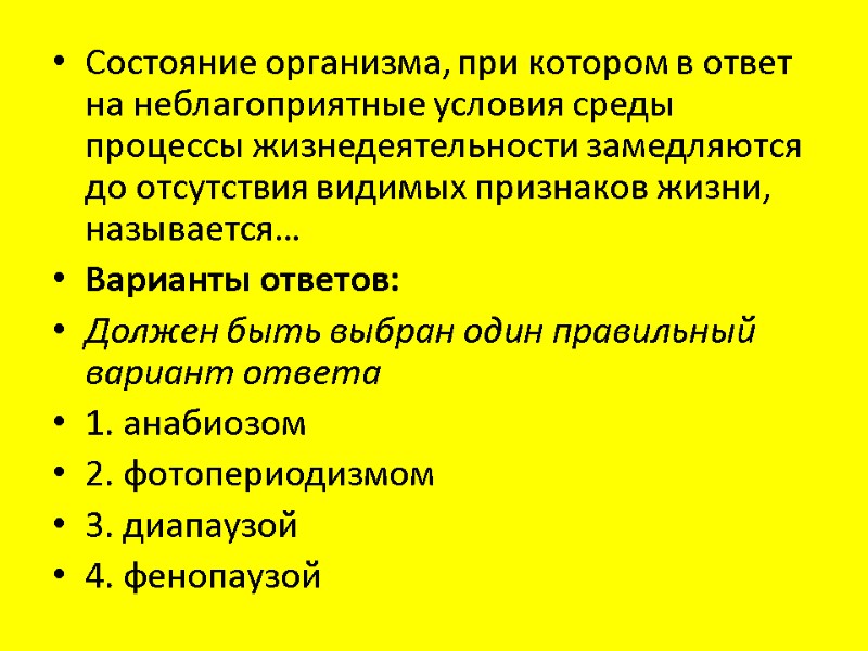 Состояние организма, при котором в ответ на неблагоприятные условия среды процессы жизнедеятельности замедляются до отсутствия видимых признаков жизни, называется… Варианты ответов: Должен быть выбран один правильный вариант ответа 1. анабиозом 2. фотопериодизмом 3. диапаузой 4. фенопаузой