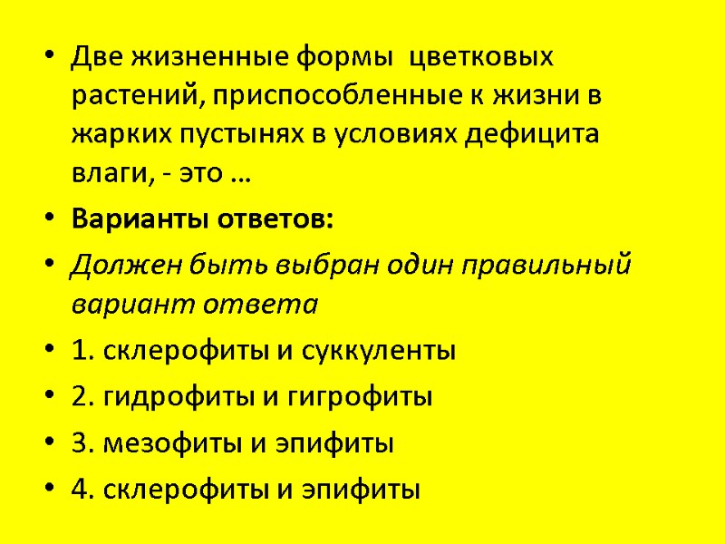 Две жизненные формы цветковых растений, приспособленные к жизни в жарких пустынях в условиях дефицита влаги, - это … Варианты ответов: Должен быть выбран один правильный вариант ответа 1. склерофиты и суккуленты 2. гидрофиты и гигрофиты 3. мезофиты и эпифиты 4. склерофиты и эпифиты