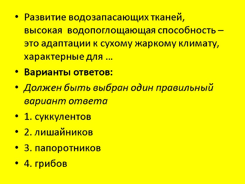 Развитие водозапасающих тканей, высокая водопоглощающая способность – это адаптации к сухому жаркому климату, характерные для … Варианты ответов: Должен быть выбран один правильный вариант ответа 1. суккулентов 2. лишайников 3. папоротников 4. грибов