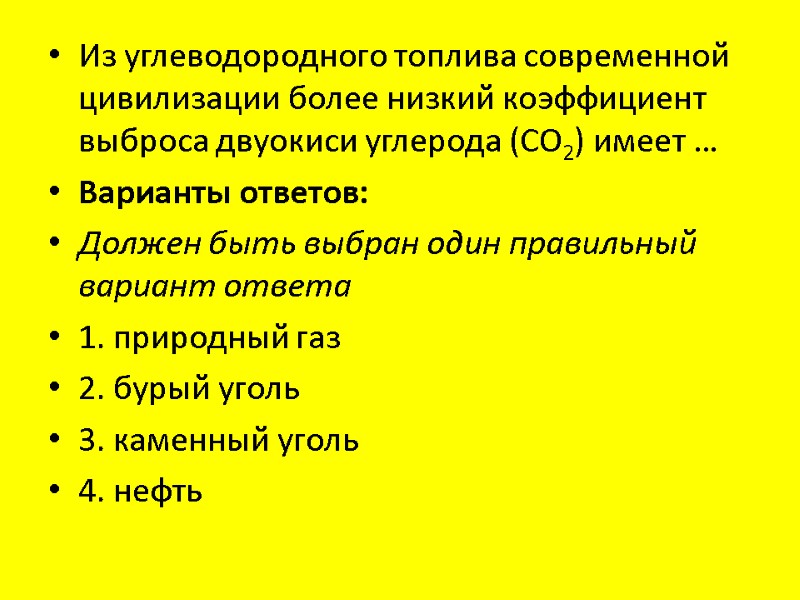 Из углеводородного топлива современной цивилизации более низкий коэффициент выброса двуокиси углерода (CO2) имеет … Варианты ответов: Должен быть выбран один правильный вариант ответа 1. природный газ 2. бурый уголь 3. каменный уголь 4. нефть