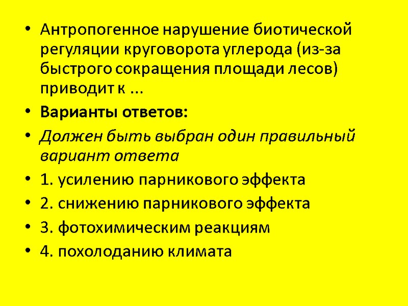 Антропогенное нарушение биотической регуляции круговорота углерода (из-за быстрого сокращения площади лесов) приводит к ... Варианты ответов: Должен быть выбран один правильный вариант ответа 1. усилению парникового эффекта 2. снижению парникового эффекта 3. фотохимическим реакциям 4. похолоданию климата