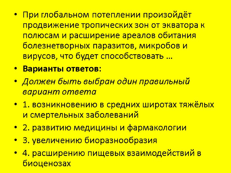 При глобальном потеплении произойдёт продвижение тропических зон от экватора к полюсам и расширение ареалов обитания болезнетворных паразитов, микробов и вирусов, что будет способствовать … Варианты ответов: Должен быть выбран один правильный вариант ответа 1. возникновению в средних широтах тяжёлых и смертельных заболеваний 2. развитию медицины и фармакологии 3. увеличению биоразнообразия 4. расширению пищевых взаимодействий в биоценозах
