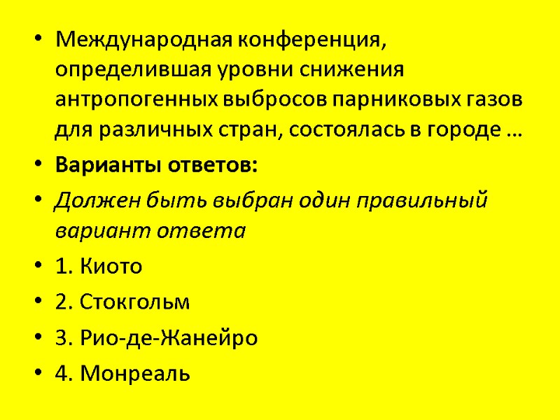 Международная конференция, определившая уровни снижения антропогенных выбросов парниковых газов для различных стран, состоялась в городе … Варианты ответов: Должен быть выбран один правильный вариант ответа 1. Киото 2. Стокгольм 3. Рио-де-Жанейро 4. Монреаль