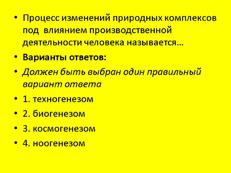 Процесс изменений природных комплексов под влиянием производственной деятельности человека называется… Варианты ответов: Должен быть выбран один правильный вариант ответа 1. техногенезом 2. биогенезом 3. космогенезом 4. ноогенезом