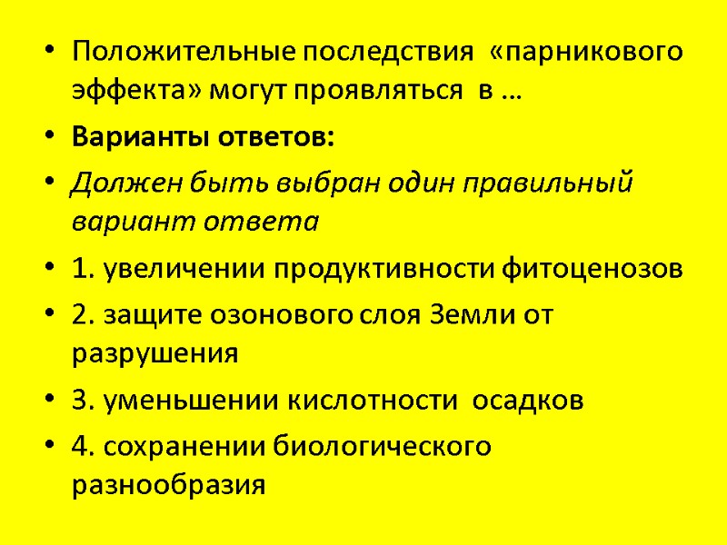 Положительные последствия «парникового эффекта» могут проявляться в … Варианты ответов: Должен быть выбран один правильный вариант ответа 1. увеличении продуктивности фитоценозов 2. защите озонового слоя Земли от разрушения 3. уменьшении кислотности осадков 4. сохранении биологического разнообразия