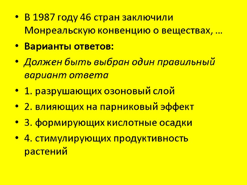 В 1987 году 46 стран заключили Монреальскую конвенцию о веществах, … Варианты ответов: Должен быть выбран один правильный вариант ответа 1. разрушающих озоновый слой 2. влияющих на парниковый эффект 3. формирующих кислотные осадки 4. стимулирующих продуктивность растений