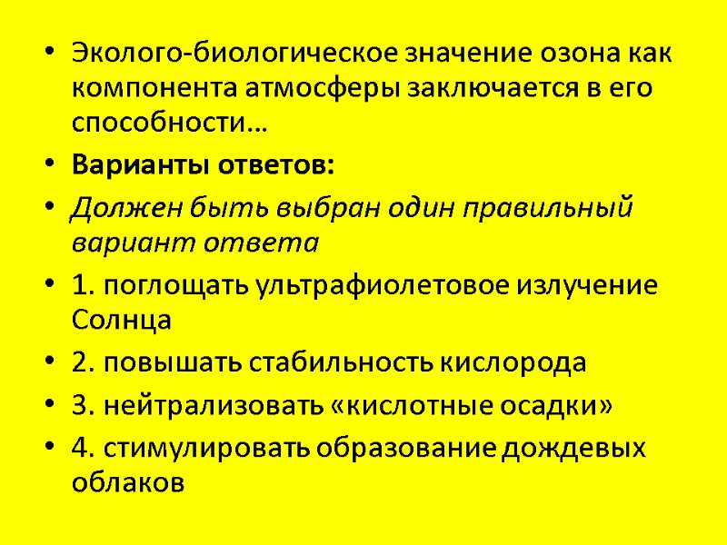 Эколого-биологическое значение озона как компонента атмосферы заключается в его способности… Варианты ответов: Должен быть выбран один правильный вариант ответа 1. поглощать ультрафиолетовое излучение Солнца 2. повышать стабильность кислорода 3. нейтрализовать «кислотные осадки» 4. стимулировать образование дождевых облаков