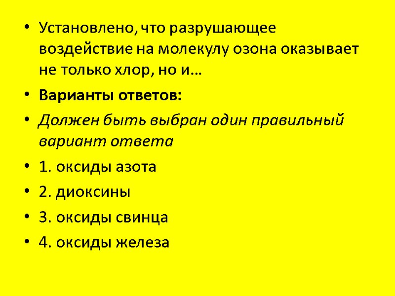Установлено, что разрушающее воздействие на молекулу озона оказывает не только хлор, но и… Варианты ответов: Должен быть выбран один правильный вариант ответа 1. оксиды азота 2. диоксины 3. оксиды свинца 4. оксиды железа