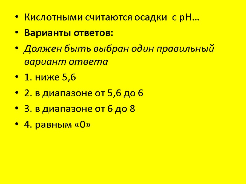 Кислотными считаются осадки с pH… Варианты ответов: Должен быть выбран один правильный вариант ответа 1. ниже 5,6 2. в диапазоне от 5,6 до 6 3. в диапазоне от 6 до 8 4. равным «0»
