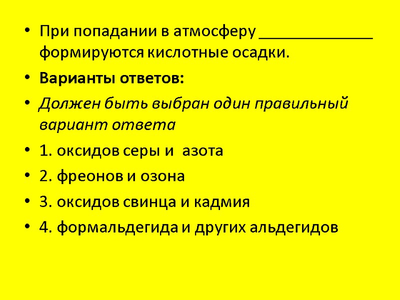 При попадании в атмосферу _____________ формируются кислотные осадки. Варианты ответов: Должен быть выбран один правильный вариант ответа 1. оксидов серы и азота 2. фреонов и озона 3. оксидов свинца и кадмия 4. формальдегида и других альдегидов