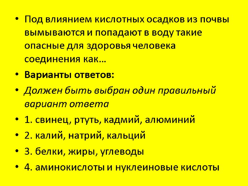 Под влиянием кислотных осадков из почвы вымываются и попадают в воду такие опасные для здоровья человека соединения как… Варианты ответов: Должен быть выбран один правильный вариант ответа 1. свинец, ртуть, кадмий, алюминий 2. калий, натрий, кальций 3. белки, жиры, углеводы 4. аминокислоты и нуклеиновые кислоты