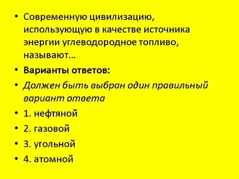 Современную цивилизацию, использующую в качестве источника энергии углеводородное топливо, называют… Варианты ответов: Должен быть выбран один правильный вариант ответа 1. нефтяной 2. газовой 3. угольной 4. атомной