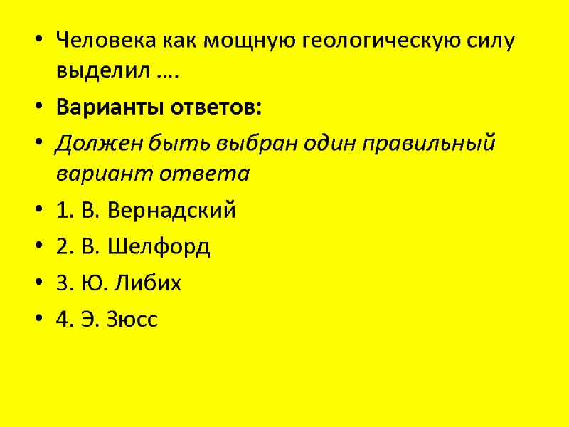 Человека как мощную геологическую силу выделил …. Варианты ответов: Должен быть выбран один правильный вариант ответа 1. В. Вернадский 2. В. Шелфорд 3. Ю. Либих 4. Э. Зюсс