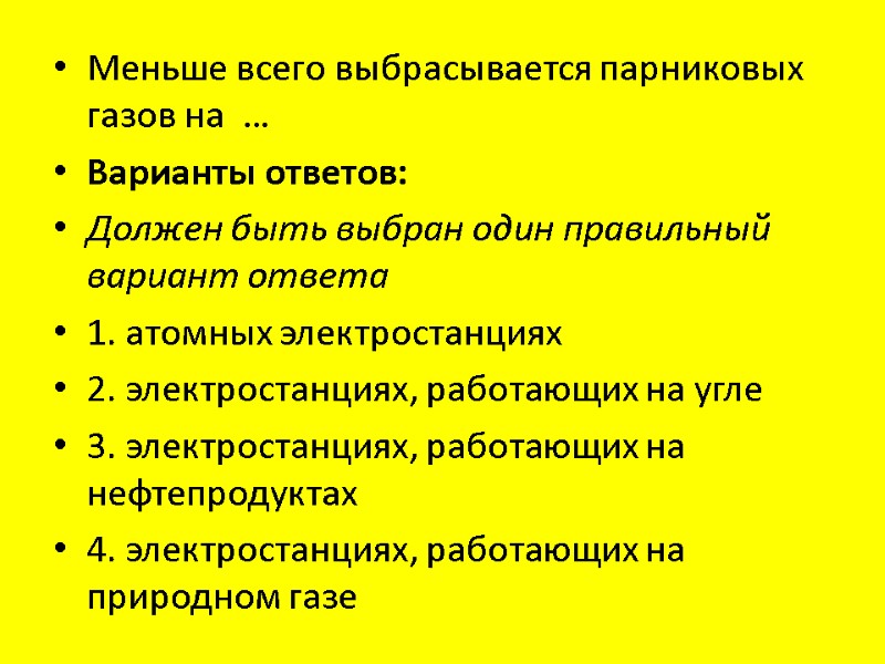 Меньше всего выбрасывается парниковых газов на … Варианты ответов: Должен быть выбран один правильный вариант ответа 1. атомных электростанциях 2. электростанциях, работающих на угле 3. электростанциях, работающих на нефтепродуктах 4. электростанциях, работающих на природном газе