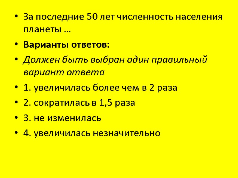 За последние 50 лет численность населения планеты … Варианты ответов: Должен быть выбран один правильный вариант ответа 1. увеличилась более чем в 2 раза 2. сократилась в 1,5 раза 3. не изменилась 4. увеличилась незначительно