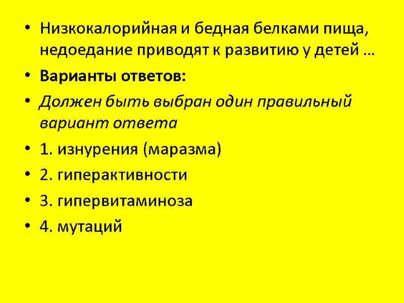 Низкокалорийная и бедная белками пища, недоедание приводят к развитию у детей … Варианты ответов: Должен быть выбран один правильный вариант ответа 1. изнурения (маразма) 2. гиперактивности 3. гипервитаминоза 4. мутаций