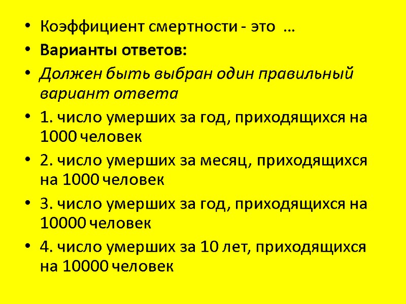 Коэффициент смертности - это … Варианты ответов: Должен быть выбран один правильный вариант ответа 1. число умерших за год, приходящихся на 1000 человек 2. число умерших за месяц, приходящихся на 1000 человек 3. число умерших за год, приходящихся на 10000 человек 4. число умерших за 10 лет, приходящихся на 10000 человек