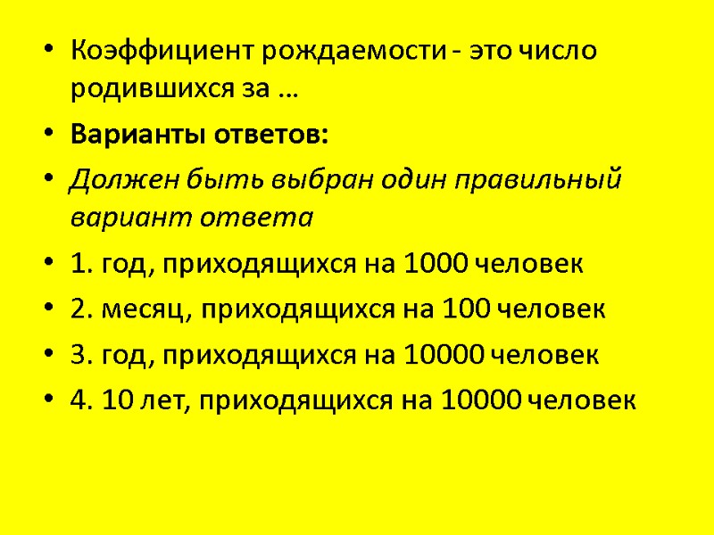 Коэффициент рождаемости - это число родившихся за … Варианты ответов: Должен быть выбран один правильный вариант ответа 1. год, приходящихся на 1000 человек 2. месяц, приходящихся на 100 человек 3. год, приходящихся на 10000 человек 4. 10 лет, приходящихся на 10000 человек