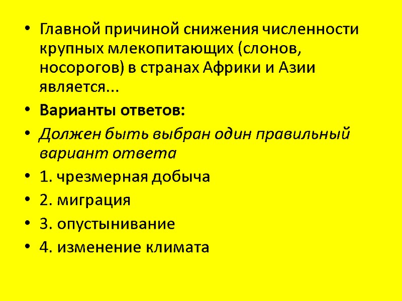 Главной причиной снижения численности крупных млекопитающих (слонов, носорогов) в странах Африки и Азии является... Варианты ответов: Должен быть выбран один правильный вариант ответа 1. чрезмерная добыча 2. миграция 3. опустынивание 4. изменение климата