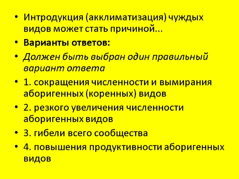 Интродукция (акклиматизация) чуждых видов может стать причиной... Варианты ответов: Должен быть выбран один правильный вариант ответа 1. сокращения численности и вымирания аборигенных (коренных) видов 2. резкого увеличения численности аборигенных видов 3. гибели всего сообщества 4. повышения продуктивности аборигенных видов