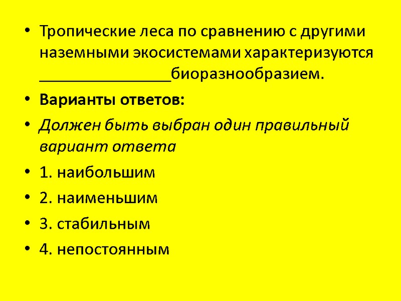 Тропические леса по сравнению с другими наземными экосистемами характеризуются _______________биоразнообразием. Варианты ответов: Должен быть выбран один правильный вариант ответа 1. наибольшим 2. наименьшим 3. стабильным 4. непостоянным