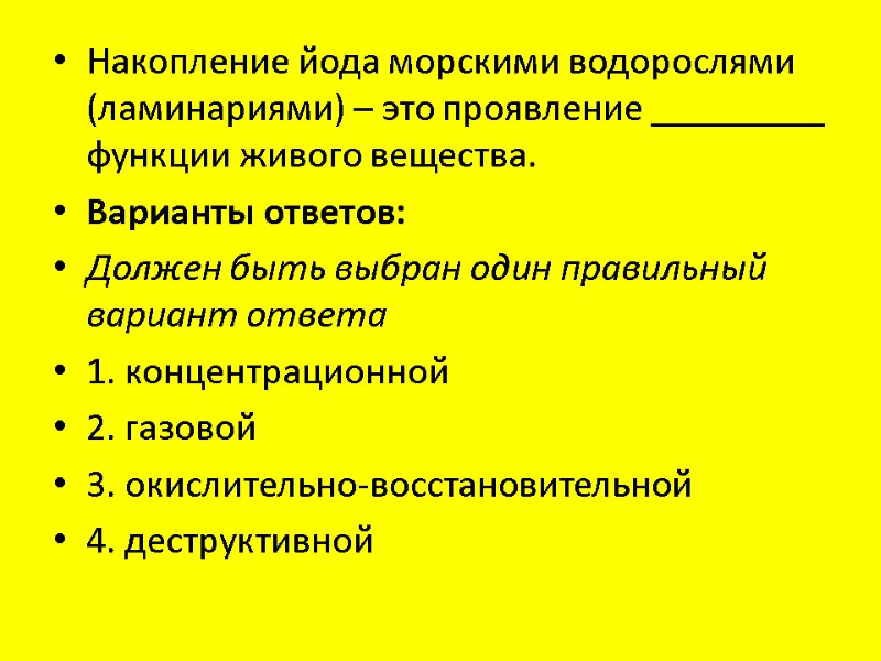Накопление йода морскими водорослями (ламинариями) – это проявление _________ функции живого вещества. Варианты ответов: Должен быть выбран один правильный вариант ответа 1. концентрационной 2. газовой 3. окислительно-восстановительной 4. деструктивной