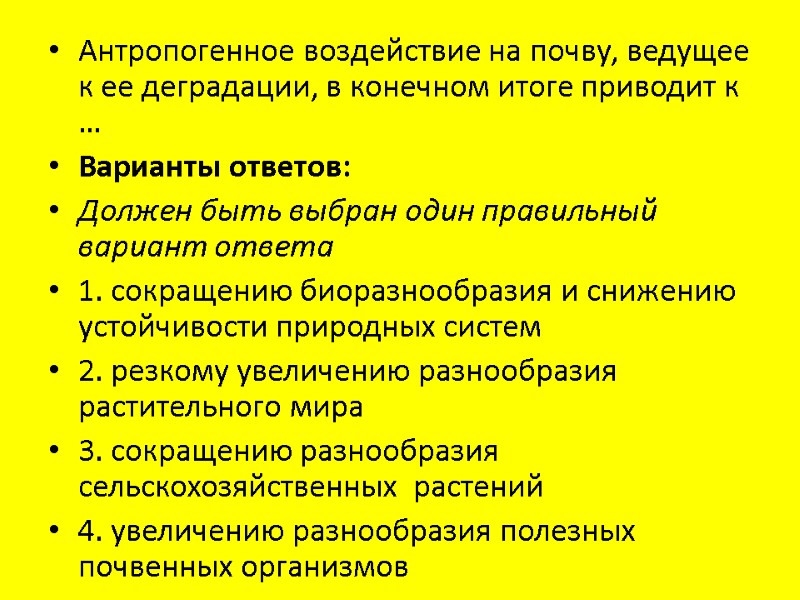 Антропогенное воздействие на почву, ведущее к ее деградации, в конечном итоге приводит к … Варианты ответов: Должен быть выбран один правильный вариант ответа 1. сокращению биоразнообразия и снижению устойчивости природных систем 2. резкому увеличению разнообразия растительного мира 3. сокращению разнообразия сельскохозяйственных растений 4. увеличению разнообразия полезных почвенных организмов