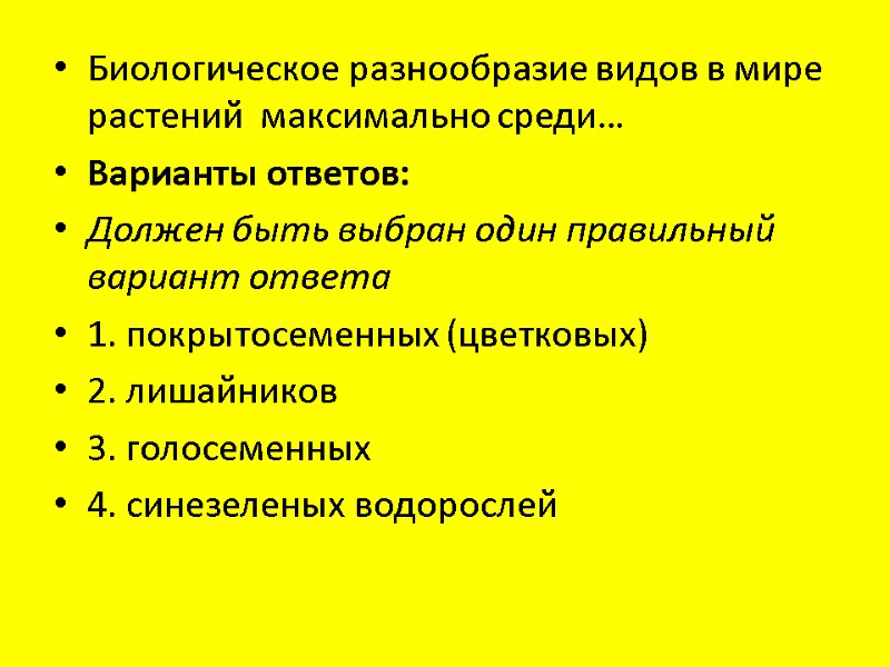 Биологическое разнообразие видов в мире растений максимально среди… Варианты ответов: Должен быть выбран один правильный вариант ответа 1. покрытосеменных (цветковых) 2. лишайников 3. голосеменных 4. синезеленых водорослей
