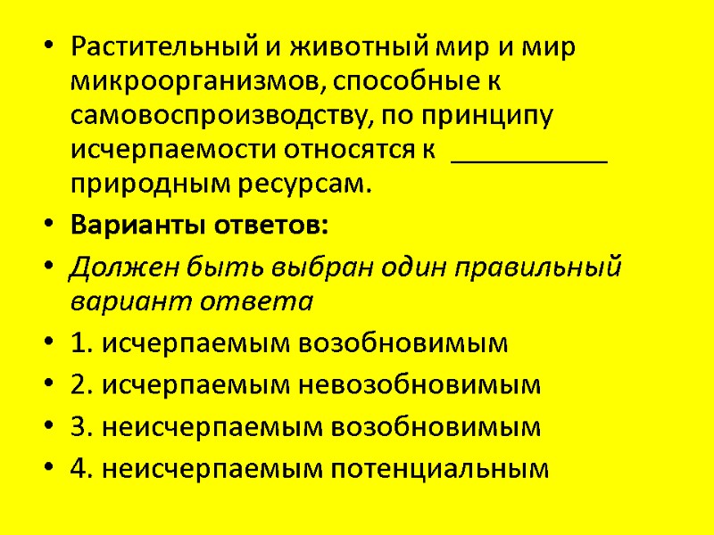 Растительный и животный мир и мир микроорганизмов, способные к самовоспроизводству, по принципу исчерпаемости относятся к __________ природным ресурсам. Варианты ответов: Должен быть выбран один правильный вариант ответа 1. исчерпаемым возобновимым 2. исчерпаемым невозобновимым 3. неисчерпаемым возобновимым 4. неисчерпаемым потенциальным