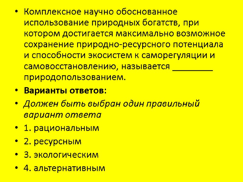 Комплексное научно обоснованное использование природных богатств, при котором достигается максимально возможное сохранение природно-ресурсного потенциала и способности экосистем к саморегуляции и самовосстановлению, называется ________ природопользованием. Варианты ответов: Должен быть выбран один правильный вариант ответа 1. рациональным 2. ресурсным 3. экологическим 4. альтернативным