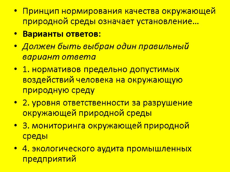 Принцип нормирования качества окружающей природной среды означает установление… Варианты ответов: Должен быть выбран один правильный вариант ответа 1. нормативов предельно допустимых воздействий человека на окружающую природную среду 2. уровня ответственности за разрушение окружающей природной среды 3. мониторинга окружающей природной среды 4. экологического аудита промышленных предприятий