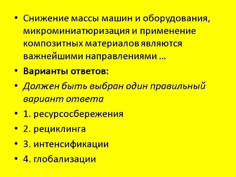 Снижение массы машин и оборудования, микроминиатюризация и применение композитных материалов являются важнейшими направлениями … Варианты ответов: Должен быть выбран один правильный вариант ответа 1. ресурсосбережения 2. рециклинга 3. интенсификации 4. глобализации