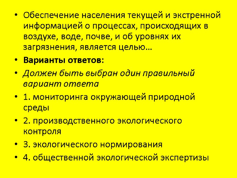 Обеспечение населения текущей и экстренной информацией о процессах, происходящих в воздухе, воде, почве, и об уровнях их загрязнения, является целью… Варианты ответов: Должен быть выбран один правильный вариант ответа 1. мониторинга окружающей природной среды 2. производственного экологического контроля 3. экологического нормирования 4. общественной экологической экспертизы