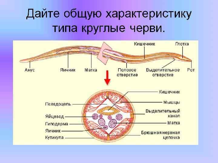Характеристика типа Круглые черви § 4. Выделительная система - кожные железы — видоизмененные протонефридии. § 5. Нервная система - головные нервные узлы (ганглии), окологлоточное кольцо и продольные стволы, более развиты спинной и брюшной. Органы чувств развиты слабо и представлены органами осязания и химического чувства. § 6. Кровеносная и дыхательная системы отсутствуют. § 7. Большинство круглых червей раздельнополые. Половая система трубчатая строение: у самки — парные яичники, яйцеводы, матки и непарное влагалище; у самца — непарные семенник, семяпровод, семяизвергательный канал, который открывается в заднюю кишку. Размножение половое. Развитие обычно проходит с неполным превращением. § В типе 5 классов. Класс Собственно круглые черви включает паразитов человека.