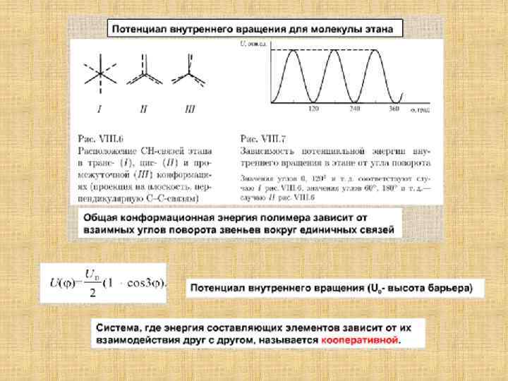 Двойственность свойств макромолекул Статистические Детерминистические Большое число внутримолекулярных степеней свободы вследствие теплового движения, поворотов и вращения вокруг единичных связей Химические связи, ближние и дальние взаимодействия Задача молекулярной биофизики: исходя из характера взаимодействия атомных групп, раскрыть природу внутримолекулярной динамики макромолекул.