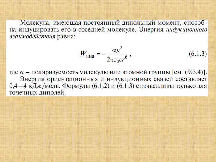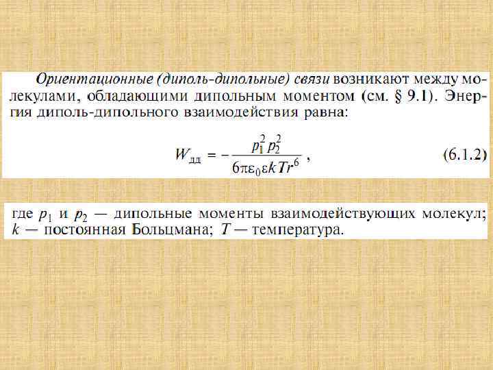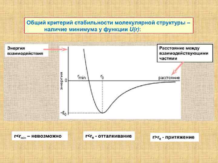 Типичный вид зависимости энергии взаимодействия от расстояния На малых расстояниях вследствие отталкивания молекул при взаимном проникновении их электронных оболочек преобладают силы отталкивания: d. Uотт(r)/dr < 0, а на больших расстояниях превалирует притяжение: d. Unp(r)/dr > 0. Общий потенциал взаимодействия U (R) представляет собой алгебраическую сумму: U(r) = Uотт(r) - Unp(r). Минимум на кривой U(r) при г = г 0 соответствует равновесному положению, в котором силы притяжения уравновешиваются силами отталкивания.