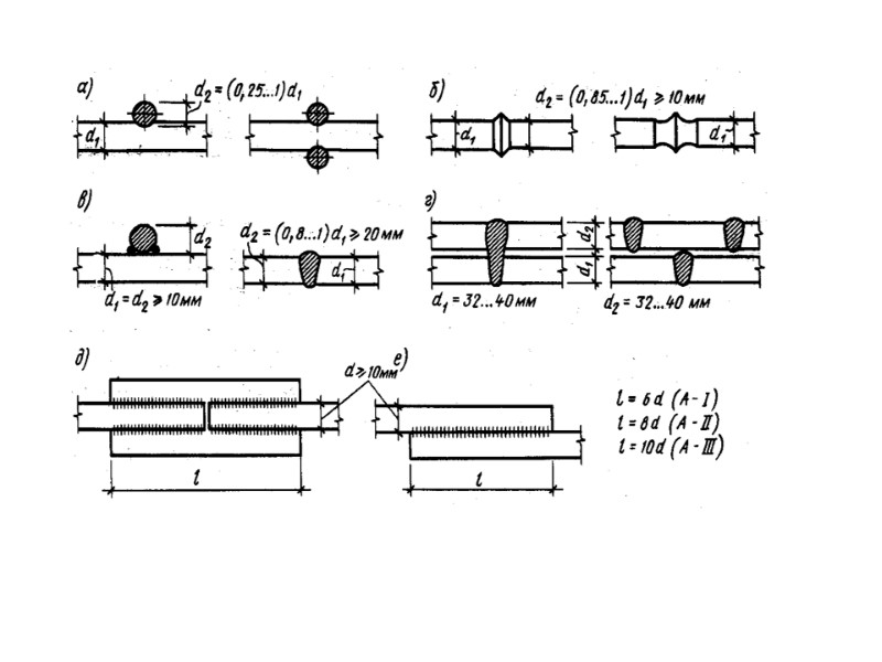 Соединение арматуры Соединение арматурных стержней каркасов и сеток осуществляется сваркой или внахлёстку. Для соединения арматурных стержней в заводских условиях применяют контактную стыковую сварку на специальных сварочных машинах. Для соединения встык при монтаже принимают дуговую ванную сварку в инвентарных формах. При d>20 мм, дуговую сварку осуществляют с накладками. Стык стержней внахлёстку без сварки допускается применять с перепуском концов стержней на 20… 50 диаметров в тех местах где прочность арматуры используется не полностью. Стыки внахлёстку допускаются в растянутых элементах.