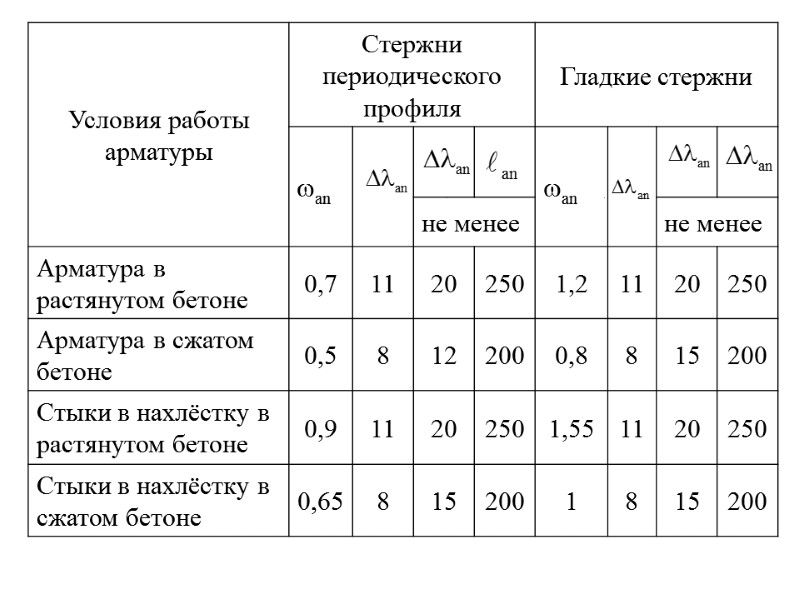 Среднее значение напряжения сцепления можно определить как частное от деления усилия «F» в стержне на площадь заделки где d - диаметр арматурного стержня. Для гладких стержней для стержней пери- одического профиля увеличивается до 7 МПа. Выражая продольное усиление через напряжение из этой формулы получим: Из формулы видно, что длина заделки (зона анкеровки), при которой обеспечивается сцепление, должна быть тем больше, чем выше прочность арматуры и диаметр стержня и может быть уменьшена с увеличением