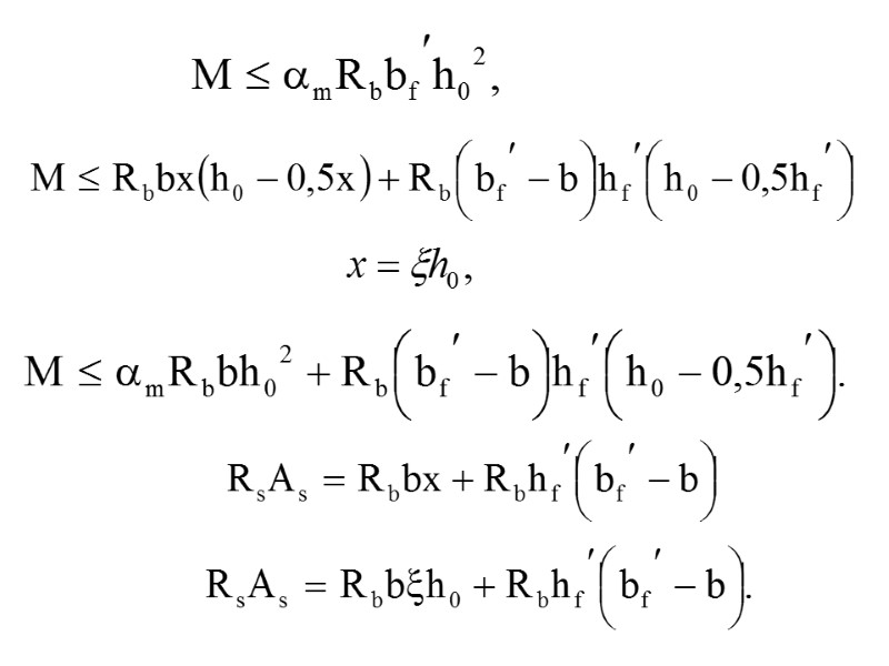 Рассмотрим 1-ый случай т.е. или где х - высота сжатой зоны бетона, которая определяется из условия: т.е. Rs As=Rb bx откуда Здесь - коэффициент армирования или - процент армирования, равный