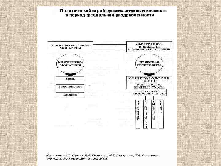 Основные модели взаимоотношения власти и общества в удельную эпоху: • 1) Традиция сильной и авторитарной княжеской власти. Именно в руках князя сосредоточены все основные нити управления своей землей, его власть мало чем ограничена и главным законом земли - воля и слово самого князя. (Владимиро-Суздальское кн. ). • 2) княжеско-боярская традиция, когда наряду с сильным князем традиция складывается не менее политически сильное боярство. И тогда власть ищет компромисс между этими силами. (Галицко-Волынская земля) • 3) - вечевая традиция, демократическая, предполагающая демократическая вовлечение и участие народа в процессе выработки властных решений (Новгородская и Псковская республики). • Каждая из данных традиций предполагает различный уклад мыслей их представителей, различную степень приобщения народа к власти.