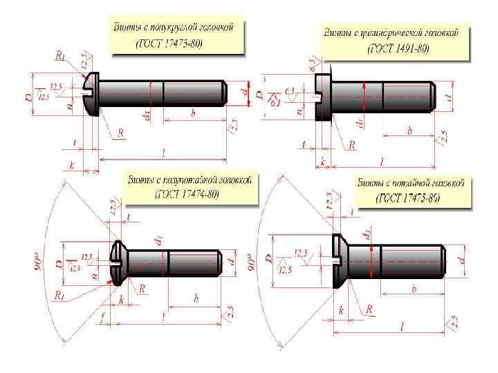 Пример условного обозначения винта класса точности А, диаметром резьбы d = 8 мм, с крупным шагом резьбы, с полем допуска резьбы 6 g, длиной l = 50 мм, класса прочности 4. 8, без покрытия: - c цилиндрической головкой : Винт А. M 8 -6 gх50. 48 ГОСТ 1491 - 80; - c полукруглой головкой: Винт A. M 8 -6 gх50. 48 ГОСТ 17473 - 80; - c полупотайной головкой: Винт А. M 8 -6 gх50. 48 ГОСТ 17474 - 80; - с потайной головкой: Винт A. M 8 -6 gх50. 48 ГОСТ 17475 - 80.
