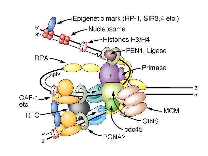 Фосфор-е геликаз MCM(2 -7) вызывает их активацию и начальное расплетание ДНК Фосфорилирование pre. RC инициирует последовательную загрузку факторов Cdc 45 и GINS (факторы отвечают за загрузку пол-альфа-праймазного комплекса и связь геликазы и реплисомы, соответственно) Сформированные одноцепочечные участки ДНК поддерживаются в таком состоянии фактором RPA