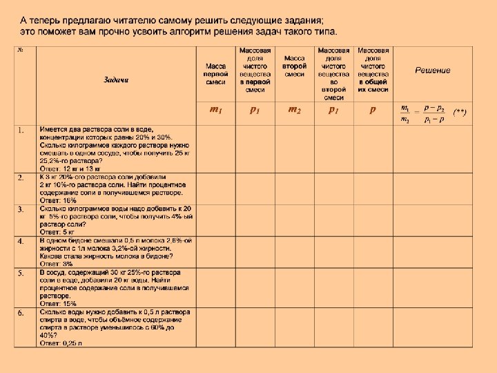 I случай: Если p 1 , p 2 и p попарно не равны, то получим формулу m 1 (p 1 - p) = m 2 ( p – p 2) (**) II случай: Возьмём два сплава с одинаковым процентным содержанием меди, т. е. p 1=p 2. Решая уравнение (*) , получим, что p 1=p 2=p , что очевидно, поскольку ни большей, ни меньшей концентрации сплав просто не получится, если исходные материалы имеют одинаковую процентную концентрацию меди, каковы бы ни были массы исходных сплавов. III случай: p 2 =p , или же будет сказано, что p 1= p , вывод тот же. Заметим, что если взять два сплава, массы которых одинаковы, т. е. m 1 = m 2 , то то есть процентное содержание нового сплава станет равно среднему арифметическому процентных концентраций исходных сплавов.