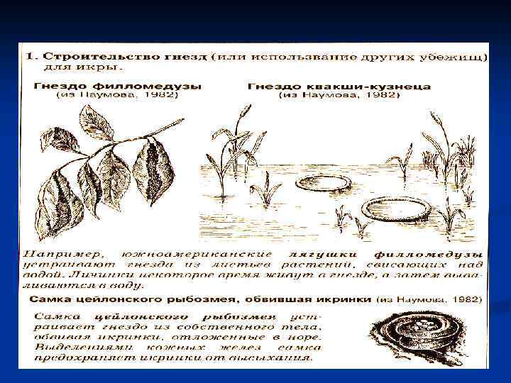 n n n n Продолжительность личиночного периода зависит от климата: в теплом климате (Украина) – 35 -40 дней, в холодном (север России) – 60 -70 дней У тритонов личинки вылупляются более сформированными: у них сильнее развит хвост, большие наружные жабры. Уже на следующий день они начинают активно охотиться за мелкими беспозвоночными. Способность личинок к половому размножению называется неотенией. Некоторые ученые предполагают, что протеи амфиумы и сирены (все хвостатые амфибий) являются неотеническими личинками каких-то саламандр, у которых в ходе эволюции совсем исчезла взрослая форма. Личинка хвостатой амфибии – амбистомы, называется аксолотлем. Она. способна размножаться. 2. Забота о потомстве. Для целого ряда видов земноводных характерна забота о потомстве, которая может проявляться самым различным образом. А) Строительство гнезд (или использование других убежищ для икры).