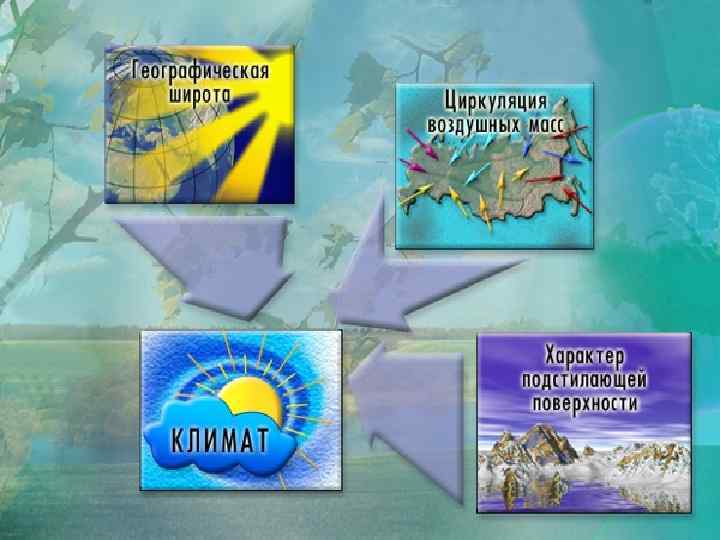 Климатообразующие факторы - причины формирования климата любого участка земной поверхности. три главные причины, под влиянием которых формируется климат: • географическая широта местности; • движение воздушных масс; • постилающая поверхность. На температуры, ветры, осадки и их режим оказывают большое влияние океаны, рельеф, морские течения и другие причины. Вследствие этого границы климатических поясов проходят не строго по параллелям, а местами отклоняются то к северу, то к югу. Наблюдаются большие различия климатических условий и внутри климатических поясов. Поэтому климатические пояса, в свою очередь, делятся на климатические области (смотрите легенду КАРТЫ АТЛАСА “Климатические пояса и области мира”).
